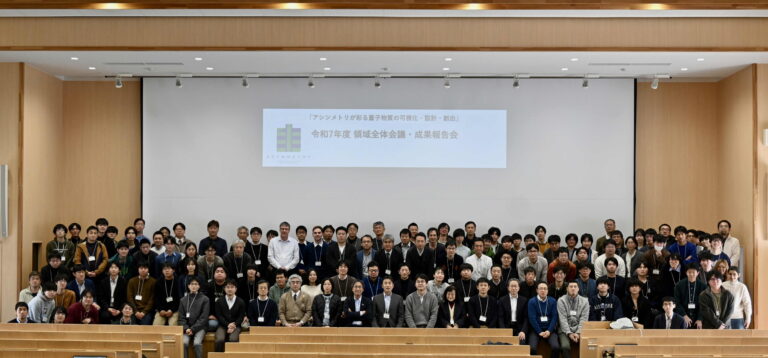 学術変革領域研究(A)「アシンメトリ量子」は3年度目の終了を迎え、中間報告をまとめる段階となりました。今回の領域全体会議では、計画研究のこれまでの研究活動とそれを踏まえての今後の研究方針、そして公募研究(第Ⅰ期)による研究成果に関する報告を行います。本研究領域の発足によって展開されてきた研究テーマについて、ここで一度総括し、最後の2年間で研究活動をさらに加速していけるよう、今後の研究方針について意見交換し、議論を深める場にしたいと考えています。ポスター講演もありますので、多くの皆様のご参加をお待ちしております。